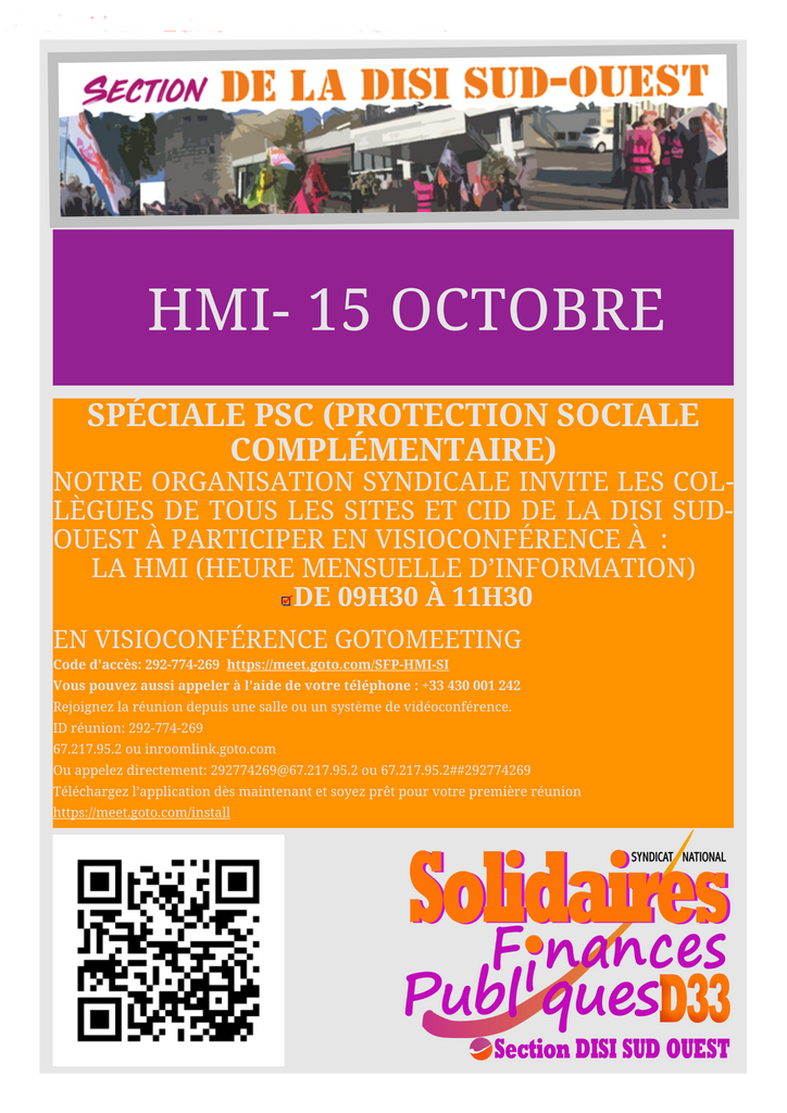 Notre organisation syndicale invite les collègues de TOUS les sites et CID de la disi Sud-Ouest (Siège  – ESI de Bordeaux – ESI de Limoges – ESI de Poitiers – ESI de Toulouse) à participer en visioconférence à la HMI (Heure mensuelle d’Information) avec Odile A de Solidaires Finances concernant la Protection Sociale Complémentaire.